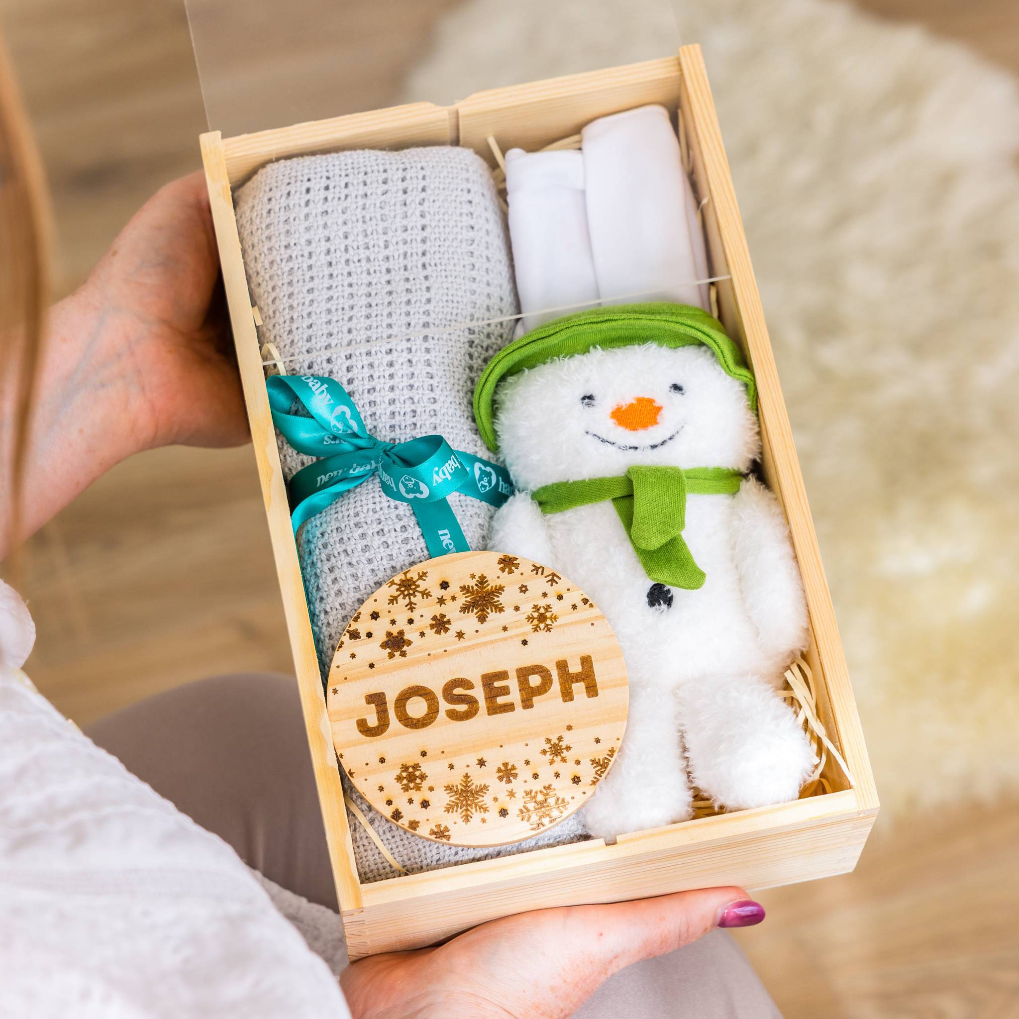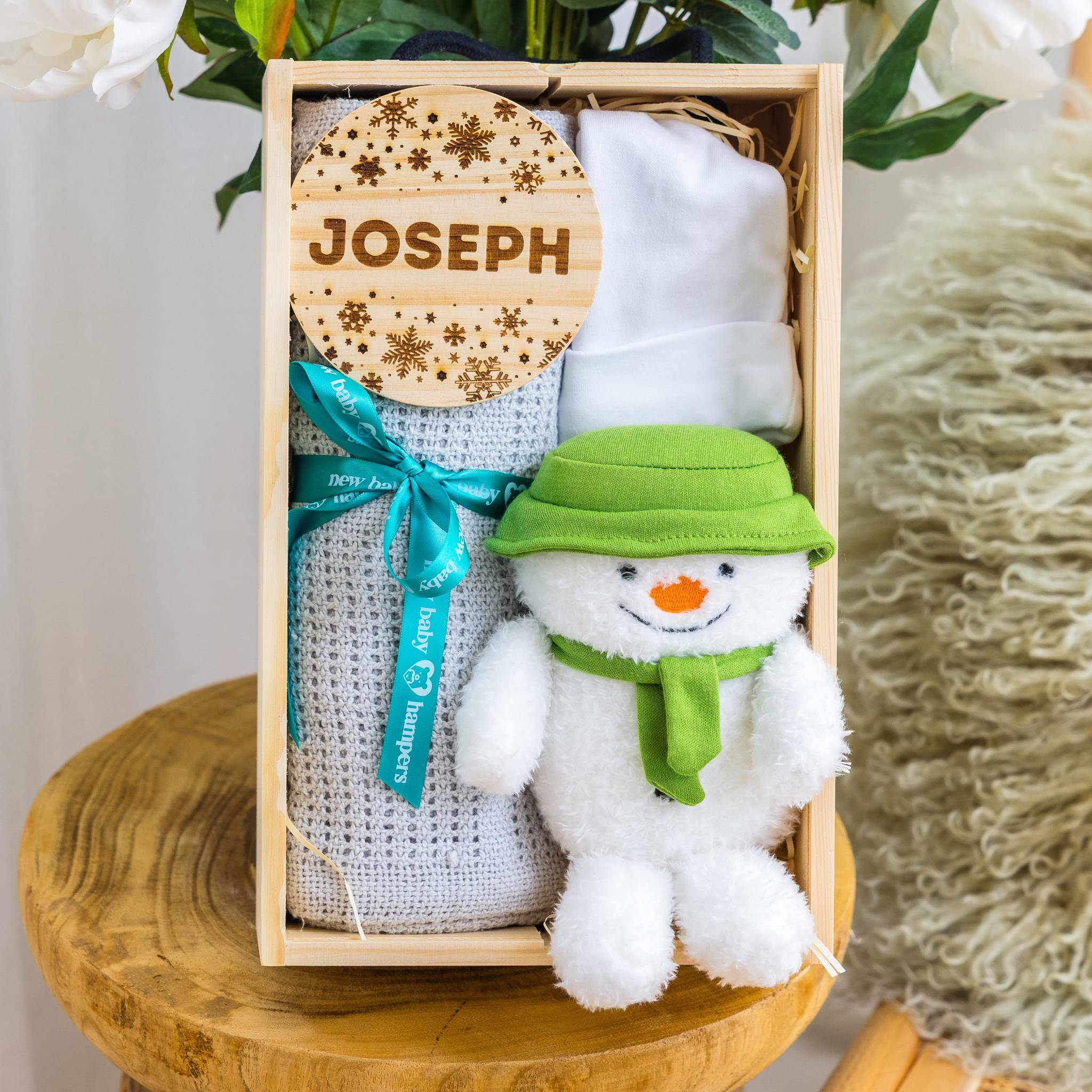 A joyful little bundle to celebrate baby’s first Christmas, filled with softness, keepsake charm and a cuddly festive friend. Beautifully presented in a wooden display box with a clear lid, this hamper is a thoughtful and heartwarming gift for the season.