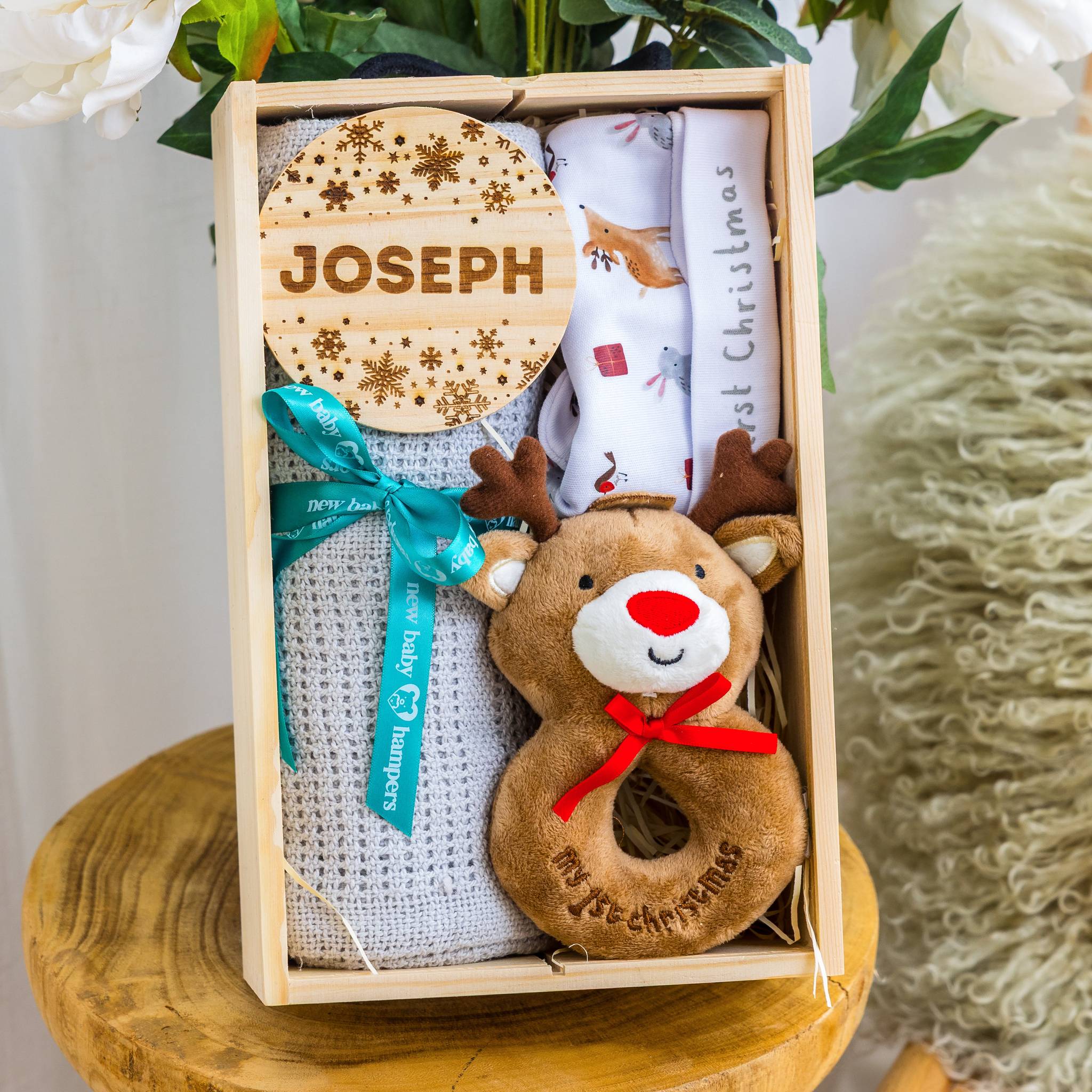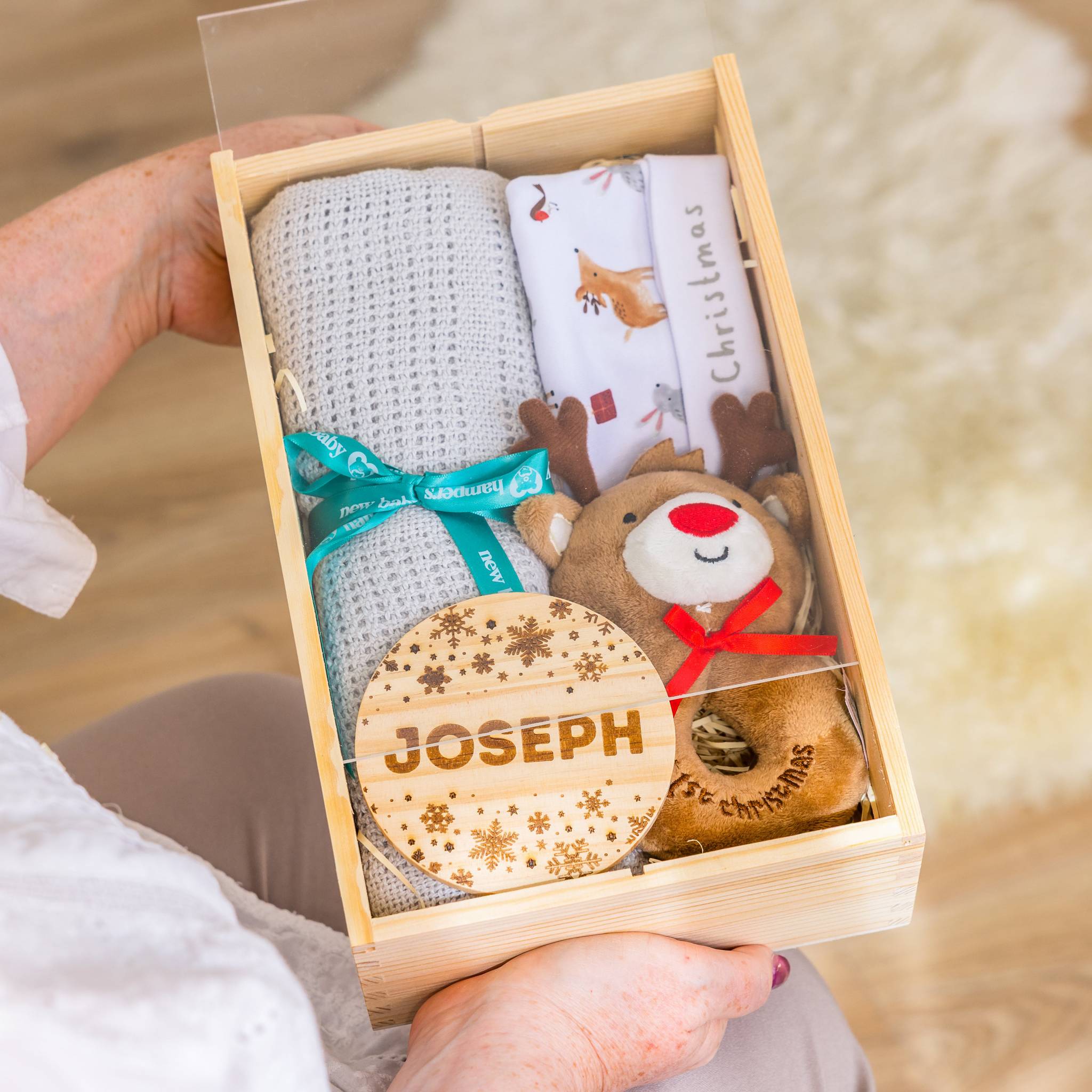 Celebrate a magical first Christmas with this beautifully curated keepsake hamper. Presented in a wooden display box with an acrylic lid, it’s packed with warmth, charm and a touch of festive sparkle, perfect for creating treasured memories.