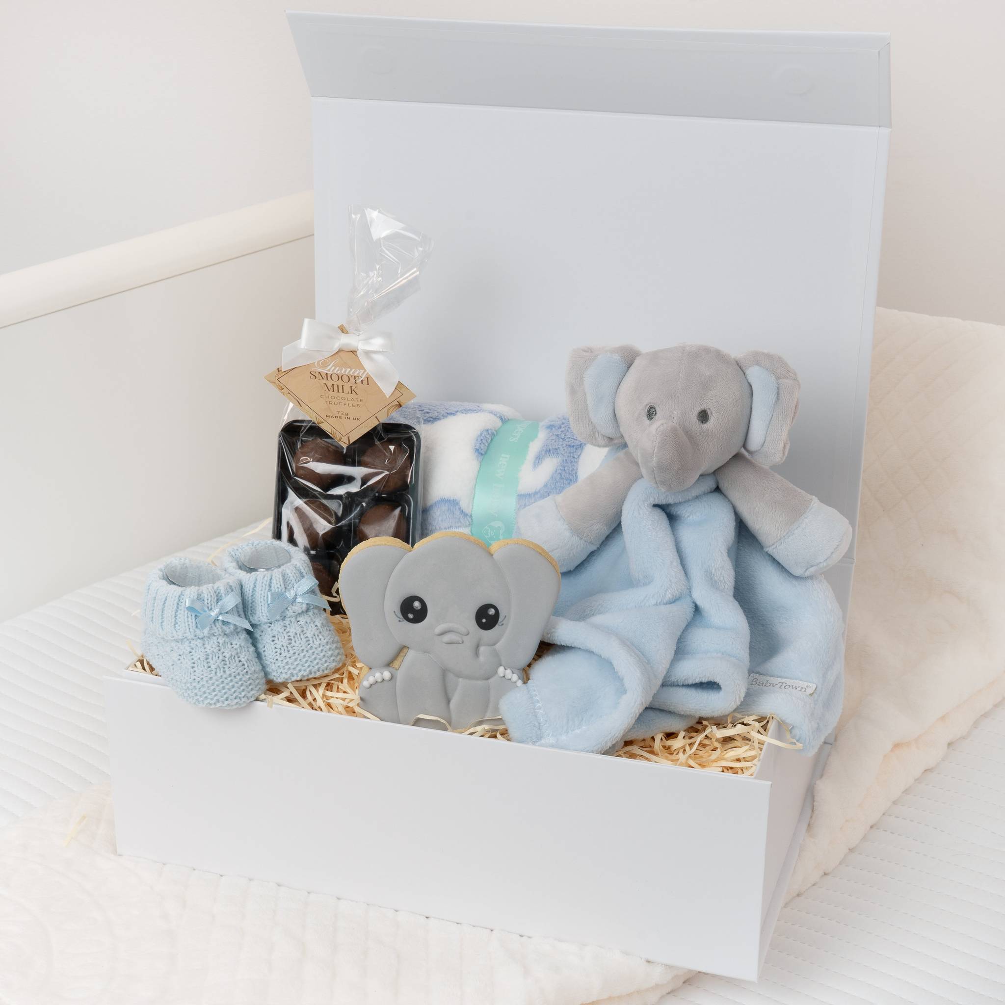 Beautifully packed in a 100% recycled, eco-friendly white keepsake box, this baby gift set is designed to delight both baby and parents. A cosy elephant-themed selection with soft textures and a little indulgence too.
