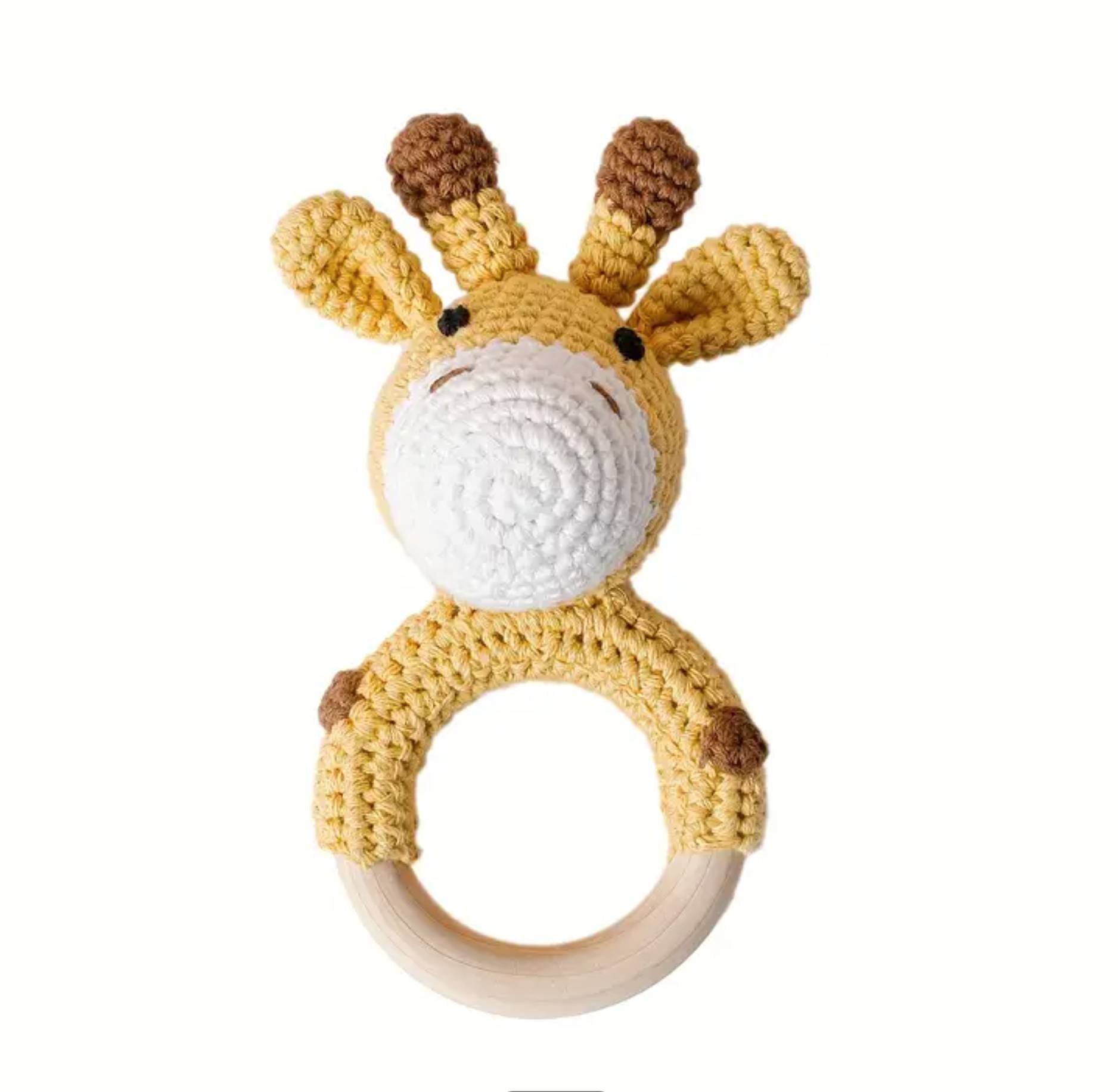 A playful little friend for tiny hands, this hand-crocheted giraffe is the perfect mix of cute and practical. With its gentle rattle sound and smooth wooden teether ring, it keeps babies soothed and entertained all in one.