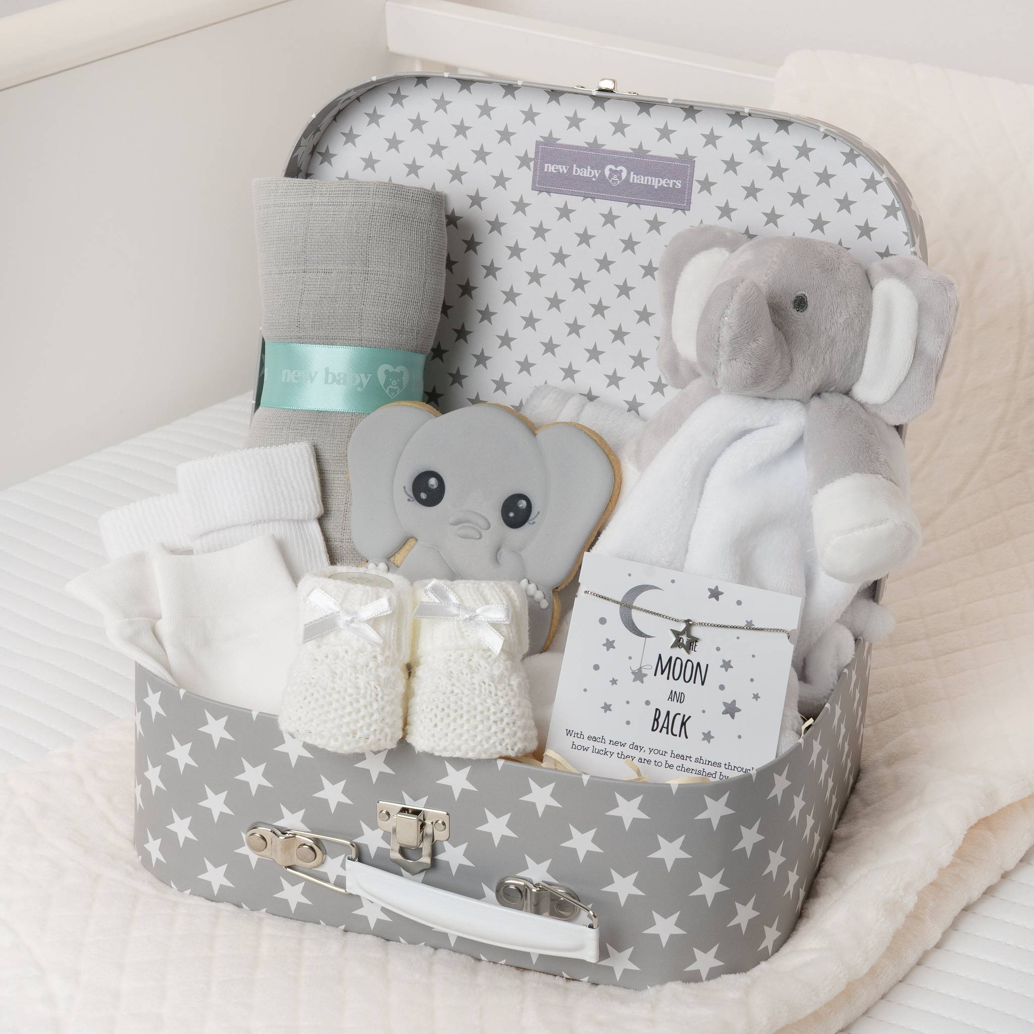 A sweet and thoughtful baby boy gift set, presented in a starry keepsake case. Filled with practical essentials and adorable keepsakes, perfect for celebrating a new arrival.