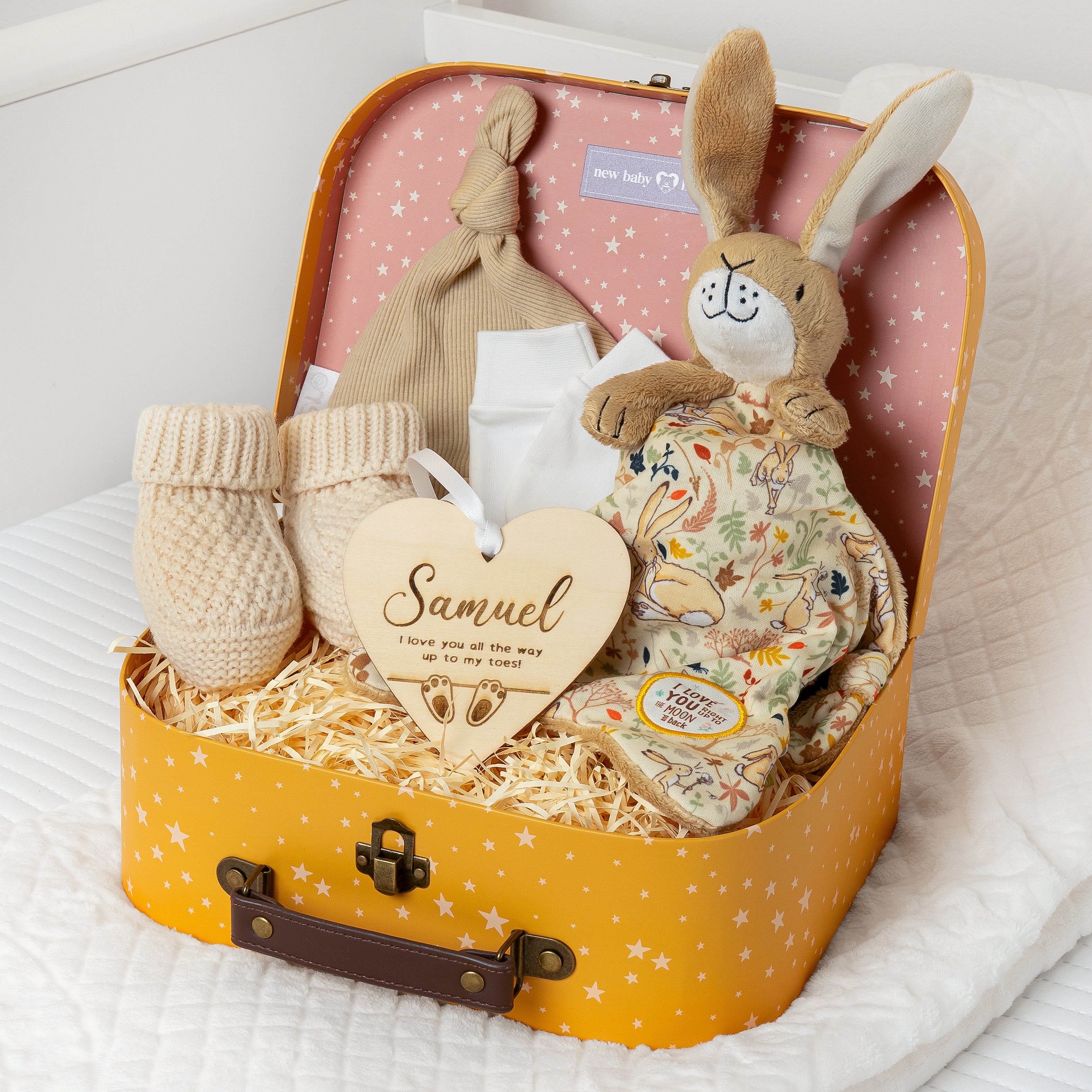 A thoughtful and heartfelt gift for a new baby, inspired by the much-loved story Guess How Much I Love You. Beautifully packed into a starry keepsake case, this sweet hamper brings together comfort, softness and a special personal touch.