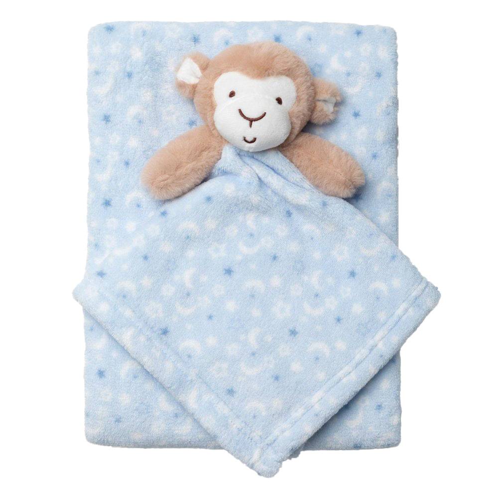 Cuddle time just got cheekier with this adorable Monkey Comforter & Blanket Set. Featuring a soft, smiley monkey comforter and a coordinating fleece blanket in a soothing blue moon-and-stars print, it’s the perfect duo for nap time, travel, or bedtime snuggles.
