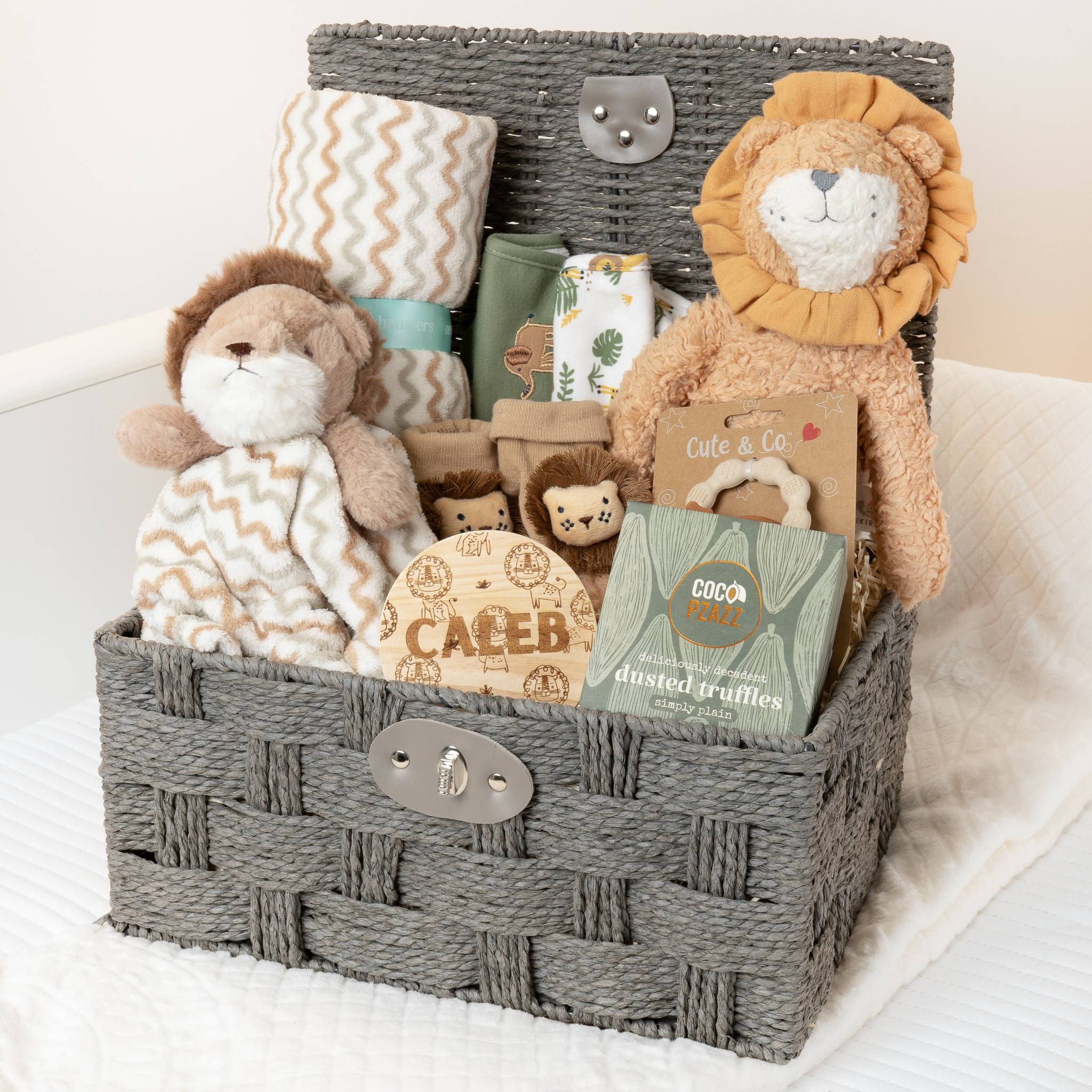 Welcome a little one into the world with this safari-themed baby hamper packed with cosy essentials, adorable accessories and a personal keepsake. Presented in a grey rope basket, it's the ideal gift for celebrating a new arrival.