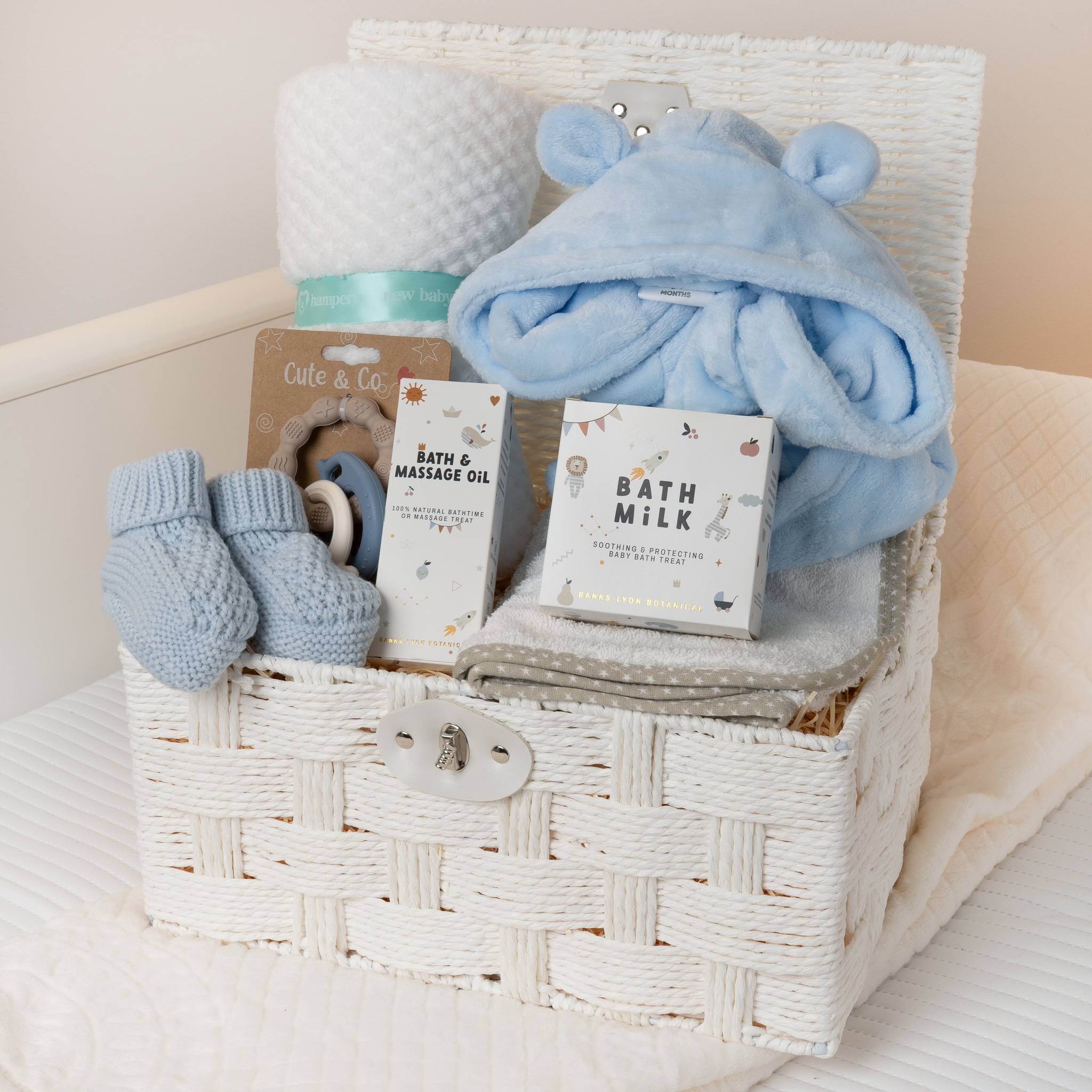 A beautifully curated blue bath time baby hamper designed for cosy snuggles and gentle bath time moments. Ideal for baby showers or welcoming a new arrival.