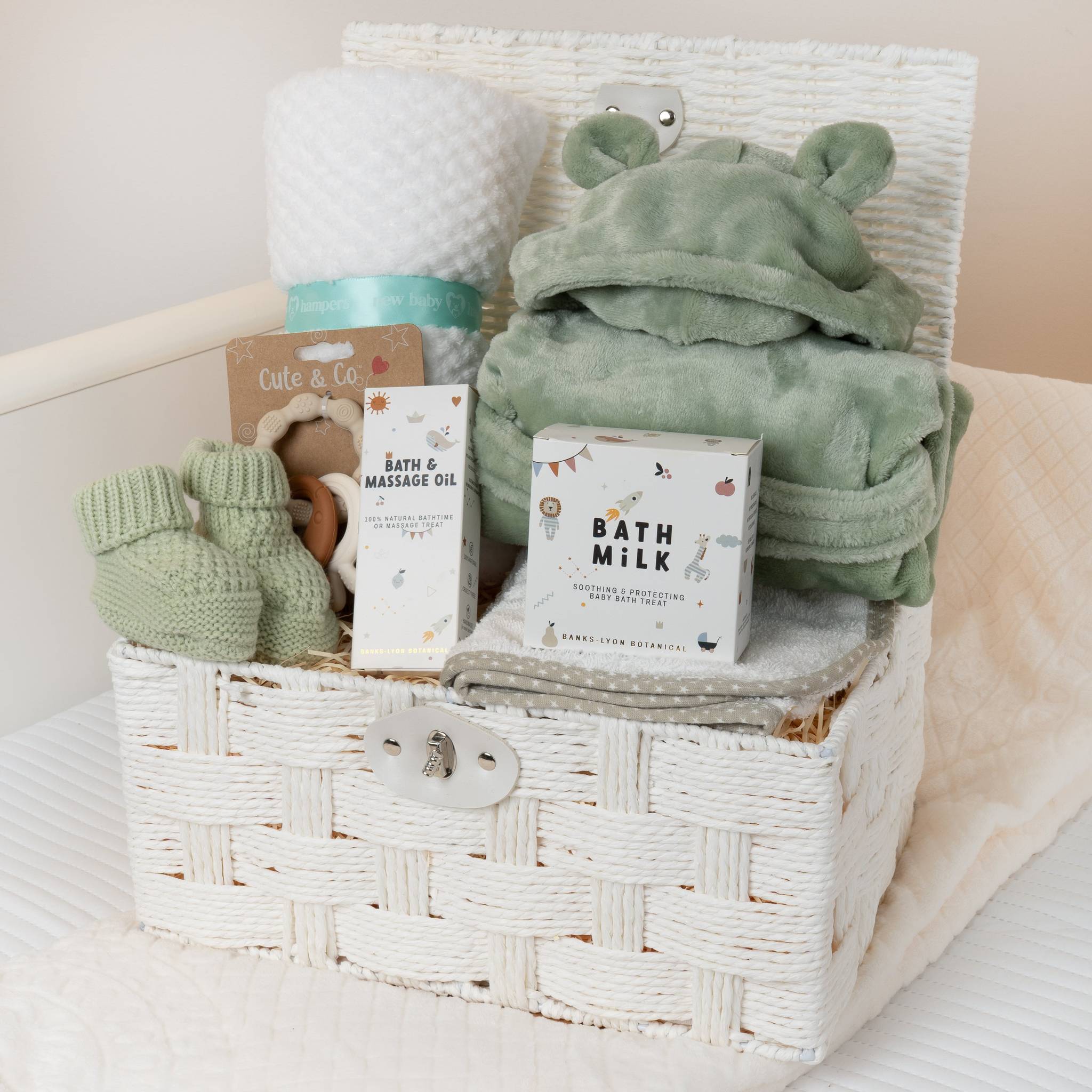 A beautifully curated unisex green bath time baby hamper designed for cosy snuggles and gentle bath time moments. Ideal for baby showers or welcoming a new arrival.