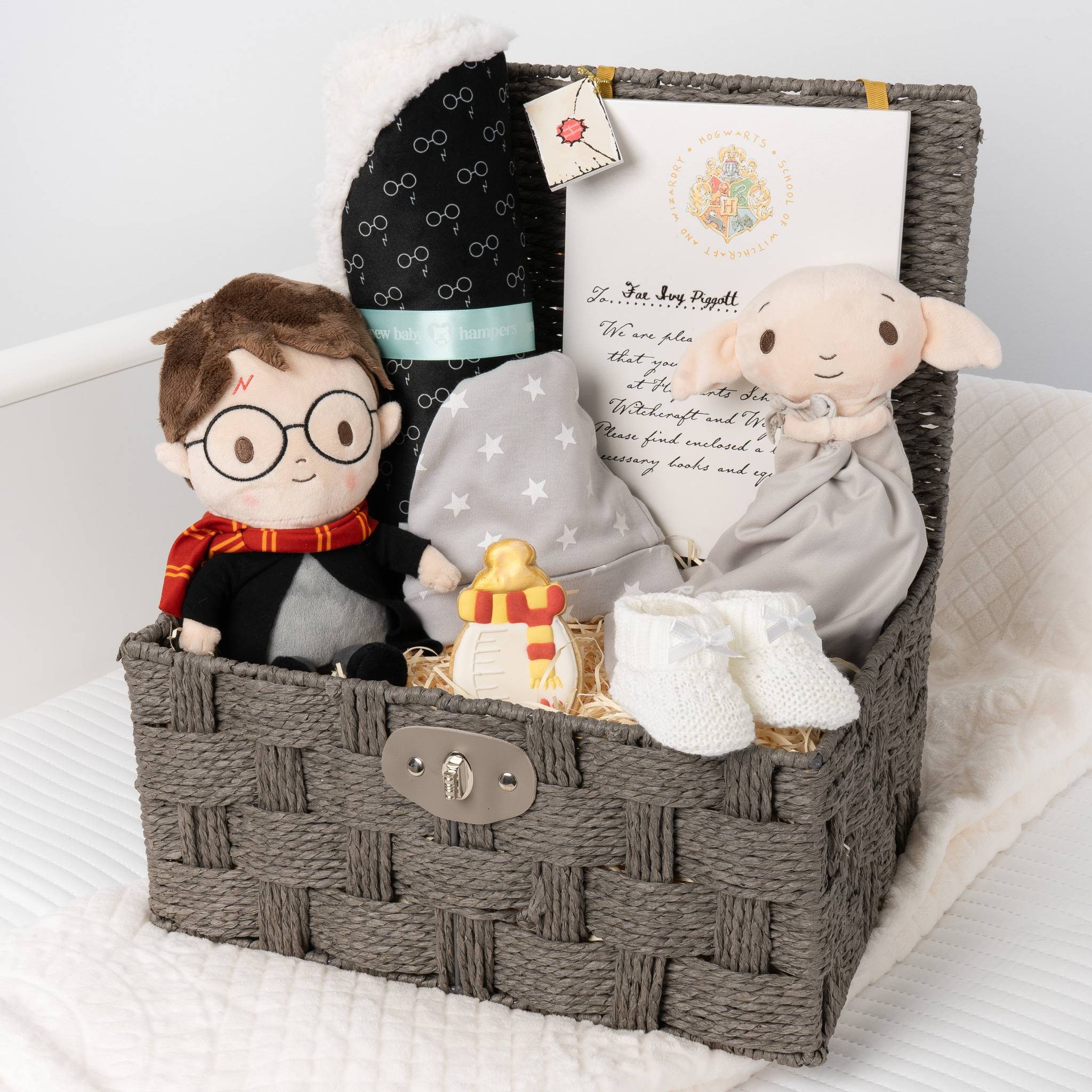 A magical gift for new parents and little wizards, this Harry Potter baby hamper features a curated selection of baby essentials and keepsakes inspired by the wizarding world. Filled with soft textures, playful characters, and licensed merchandise, it's the perfect gift to welcome a new arrival.
