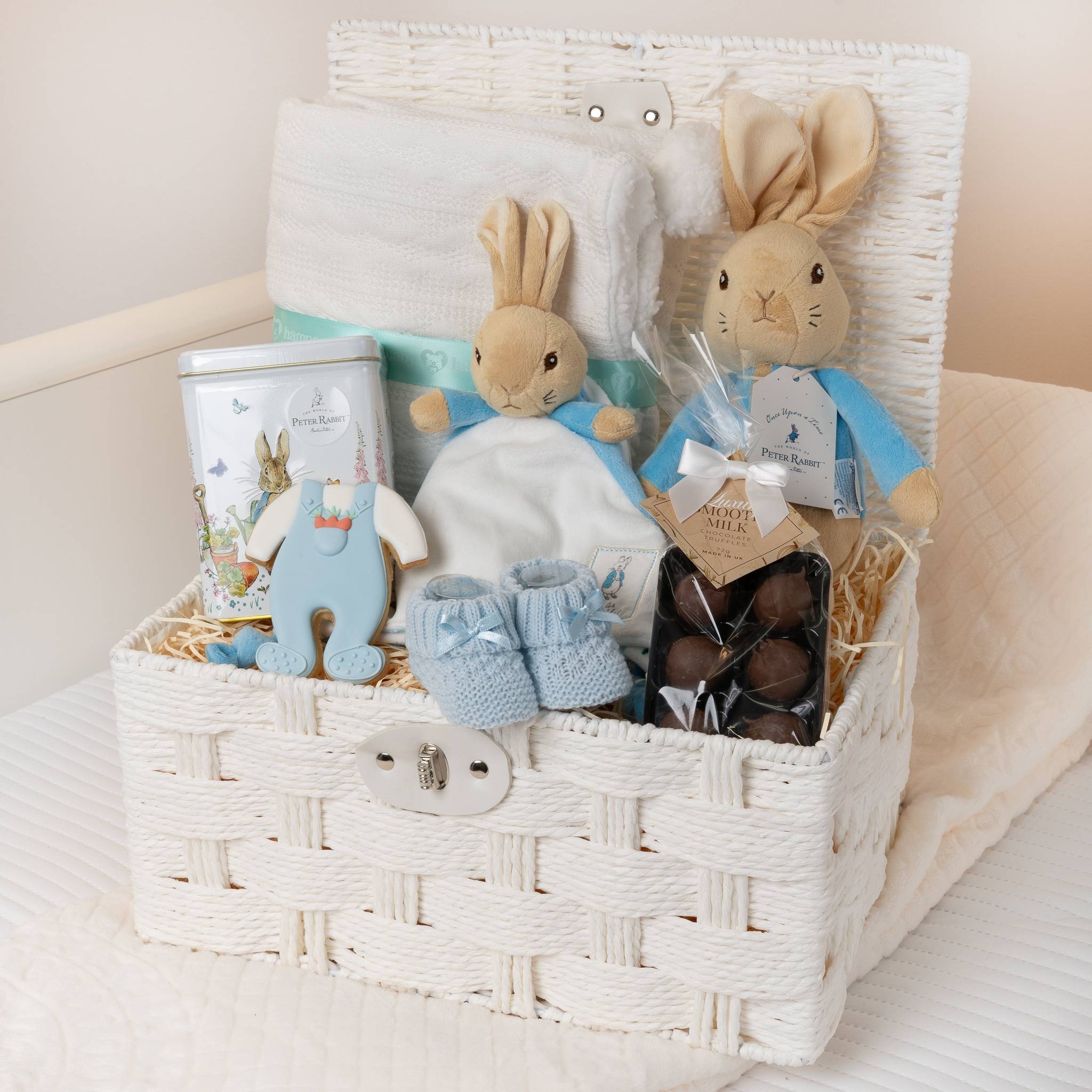 This elegant Peter Rabbit hamper in soft blues and whites is a gorgeous gift for a new baby and their parents. It's beautifully presented and ready to give, packed with thoughtful touches and a few indulgent extras.