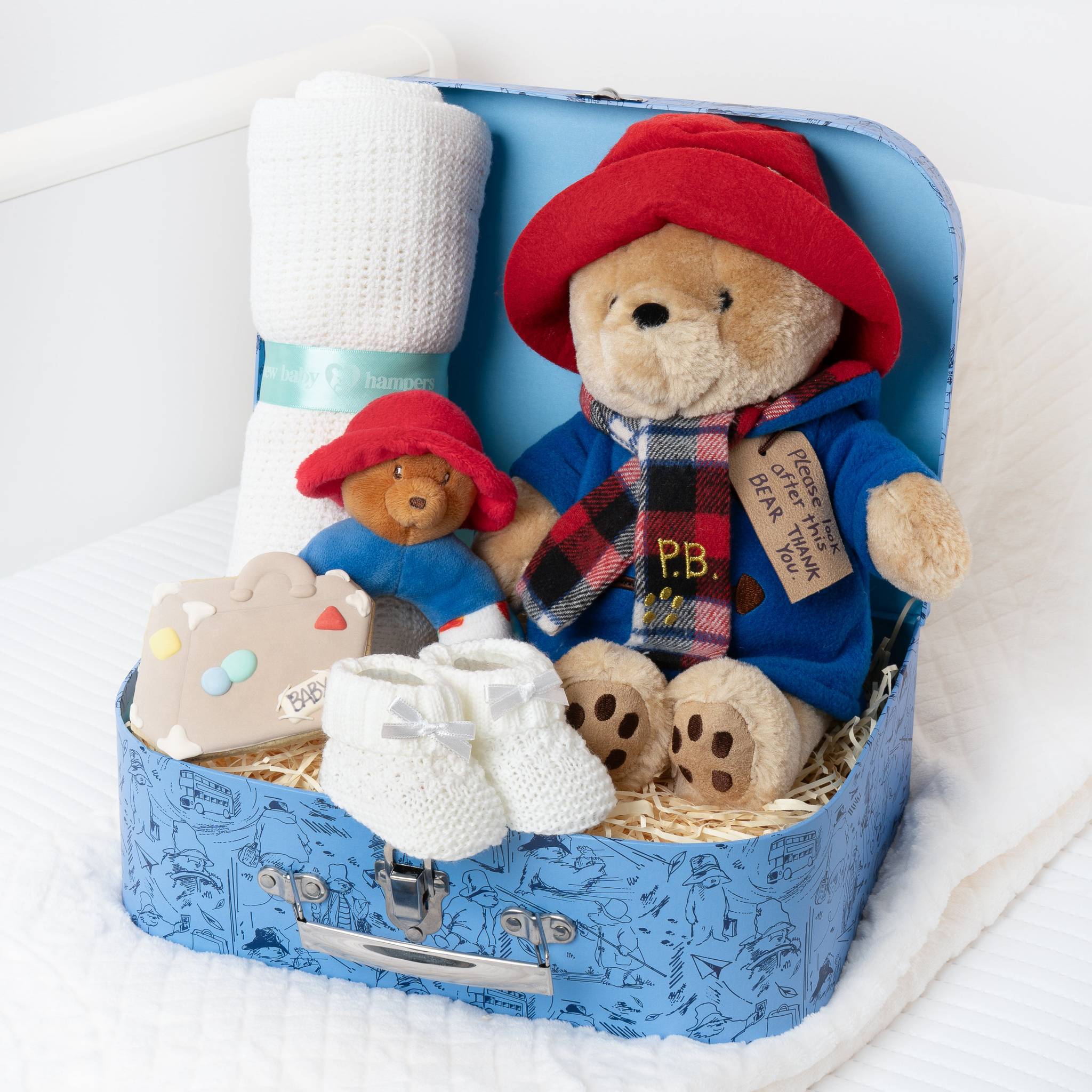 A beautiful gift for a new baby, full of classic Paddington Bear charm. This larger keepsake hamper brings together softness, sentiment and a little playfulness, all tucked neatly inside a bold illustrated suitcase.