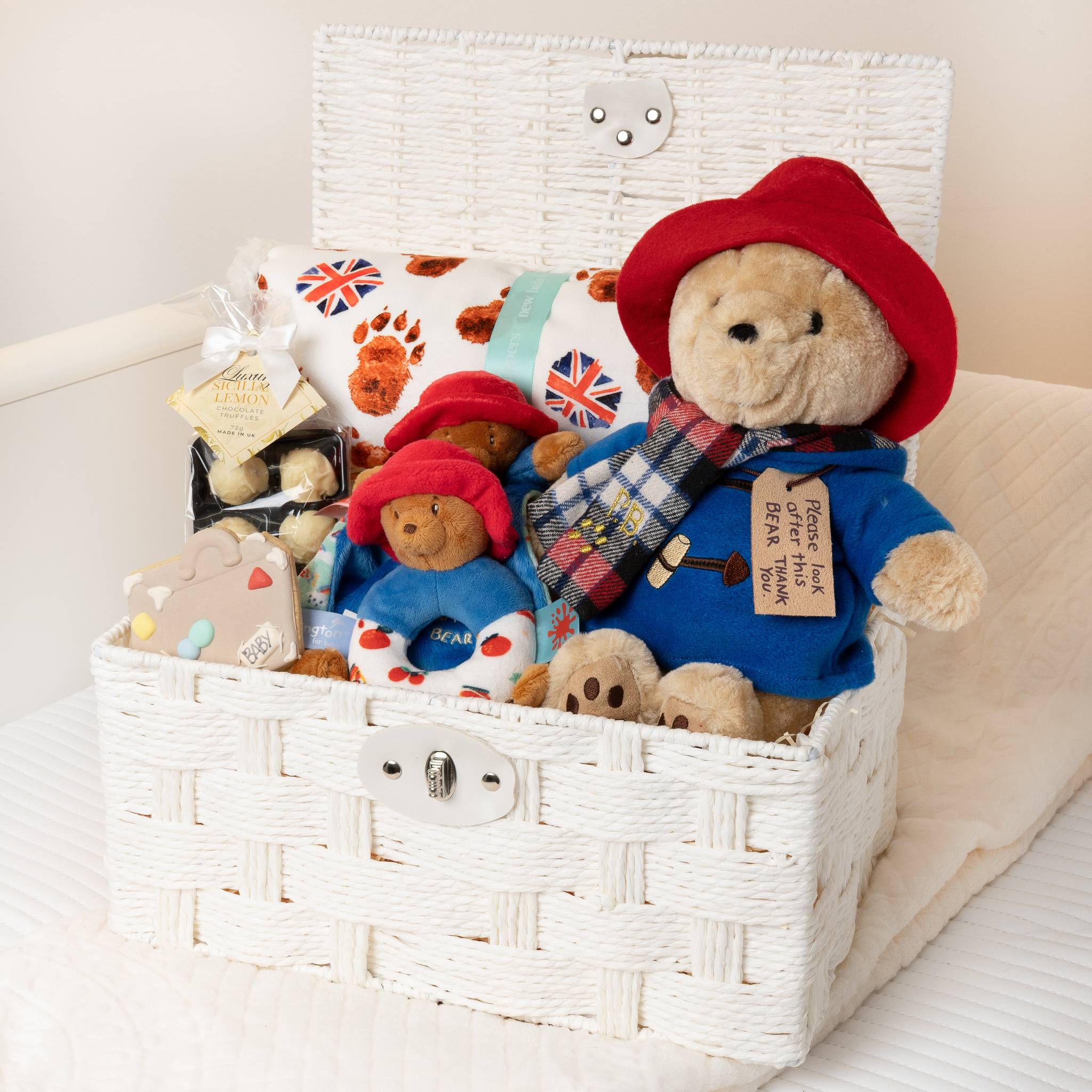 A beautifully curated gift set for a new baby, combining classic Paddington Bear keepsakes with soft comforts and a little treat for the grown-ups too. Thoughtfully packed in a white woven hamper, this luxurious bundle is perfect for welcoming a little one in style.