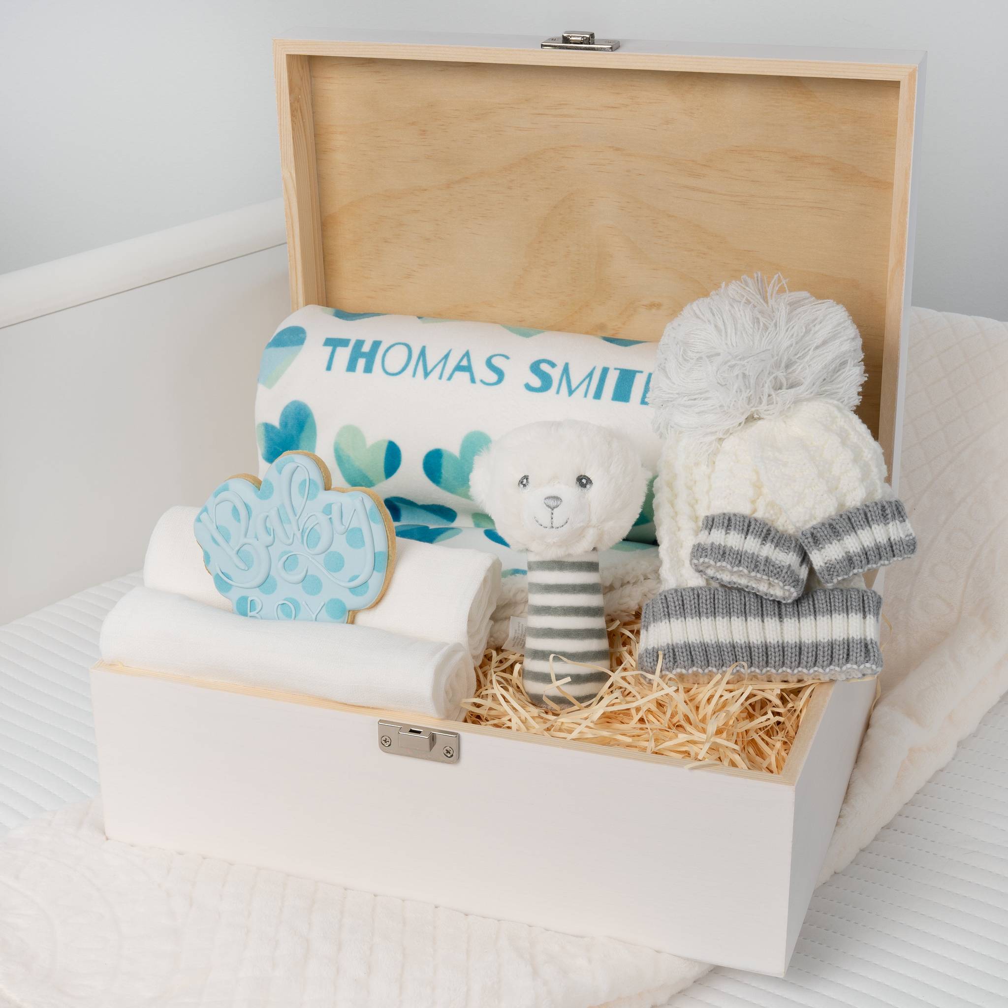 This cosy gift features a custom name blanket, soft essentials, and a sweet treat beautifully presented in a timeless wooden keepsake box.