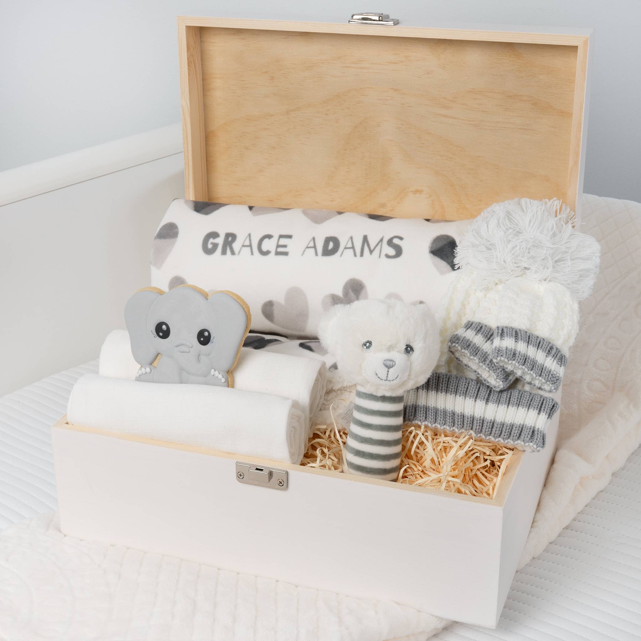 This cosy gift features a custom name blanket, soft essentials, and a sweet treat beautifully presented in a timeless wooden keepsake box.