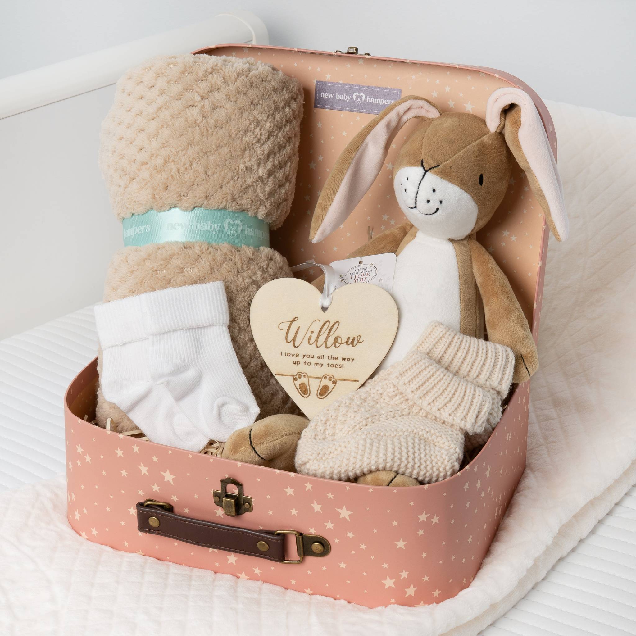 A lovely way to welcome a new baby into the world, this thoughtfully curated hamper combines soft comforts with a sweet personal keepsake. Inspired by the classic tale Guess How Much I Love You, it’s beautifully presented in a starry suitcase that’s perfect for gifting and storing keepsakes.