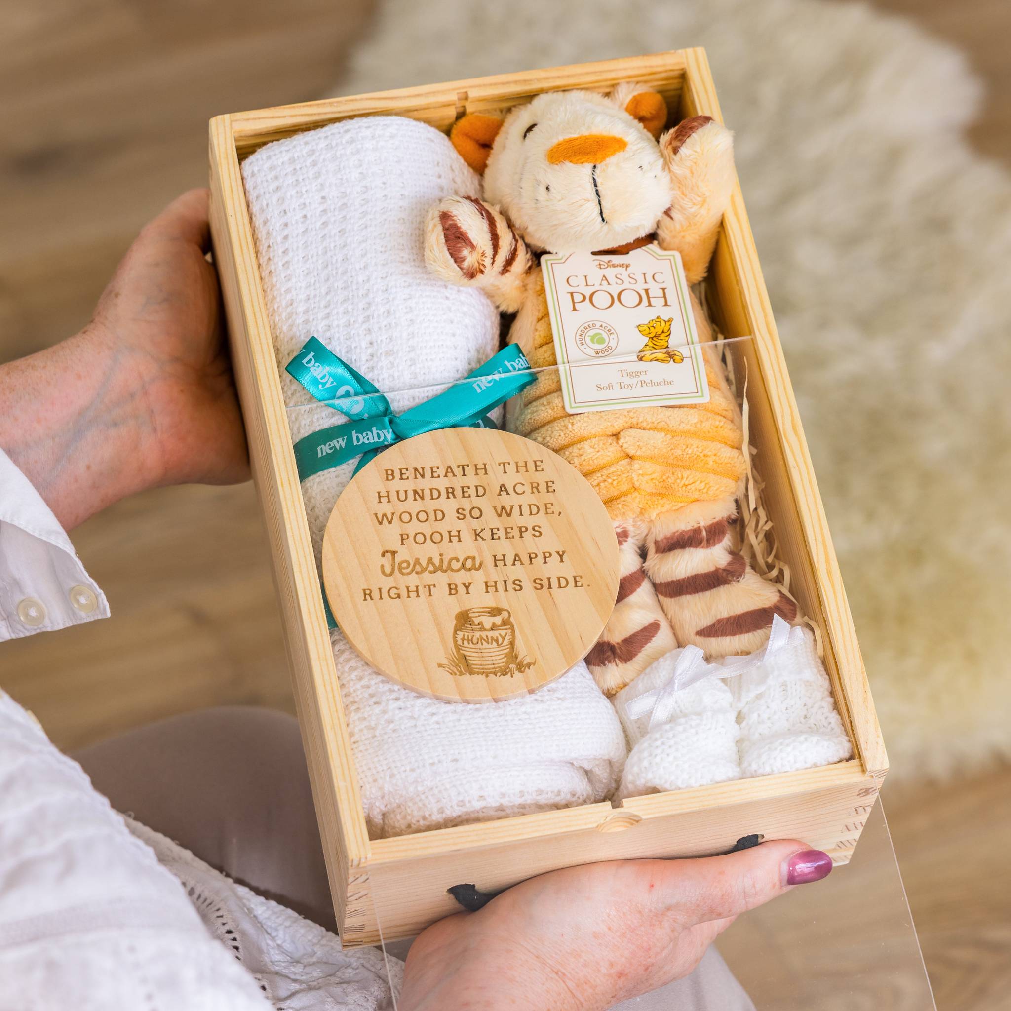 A playful and heartfelt gift for a new baby, inspired by the fun-loving spirit of Tigger and the warmth of the Hundred Acre Wood. This mini hamper is packed with softness and personal detail, making it a sweet way to celebrate a new arrival.