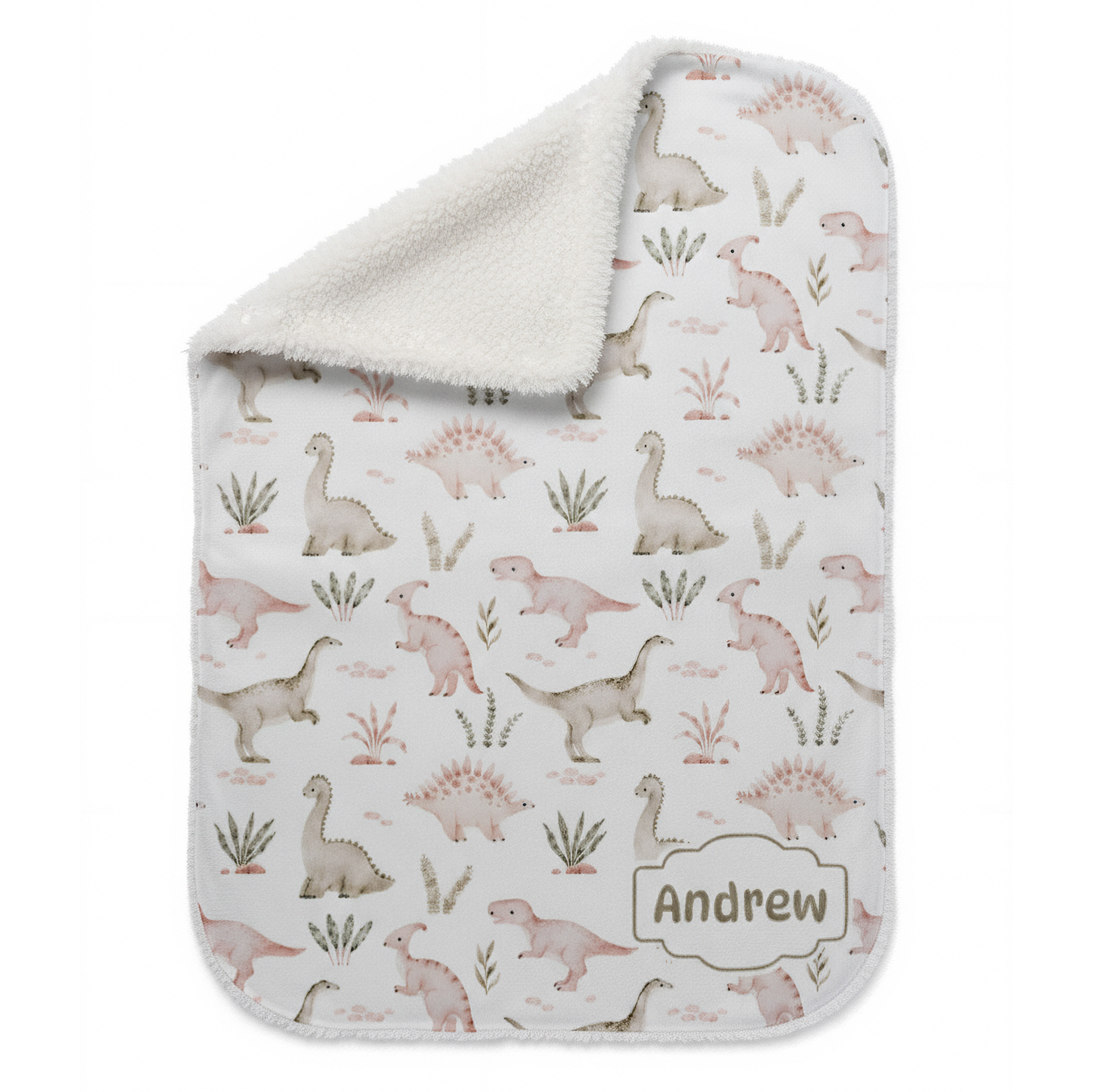 Keep your baby cosy with this personalised sherpa blanket, featuring their name and a light bold dinosaur print design. A thoughtful gift and lasting keepsake for any new arrival.