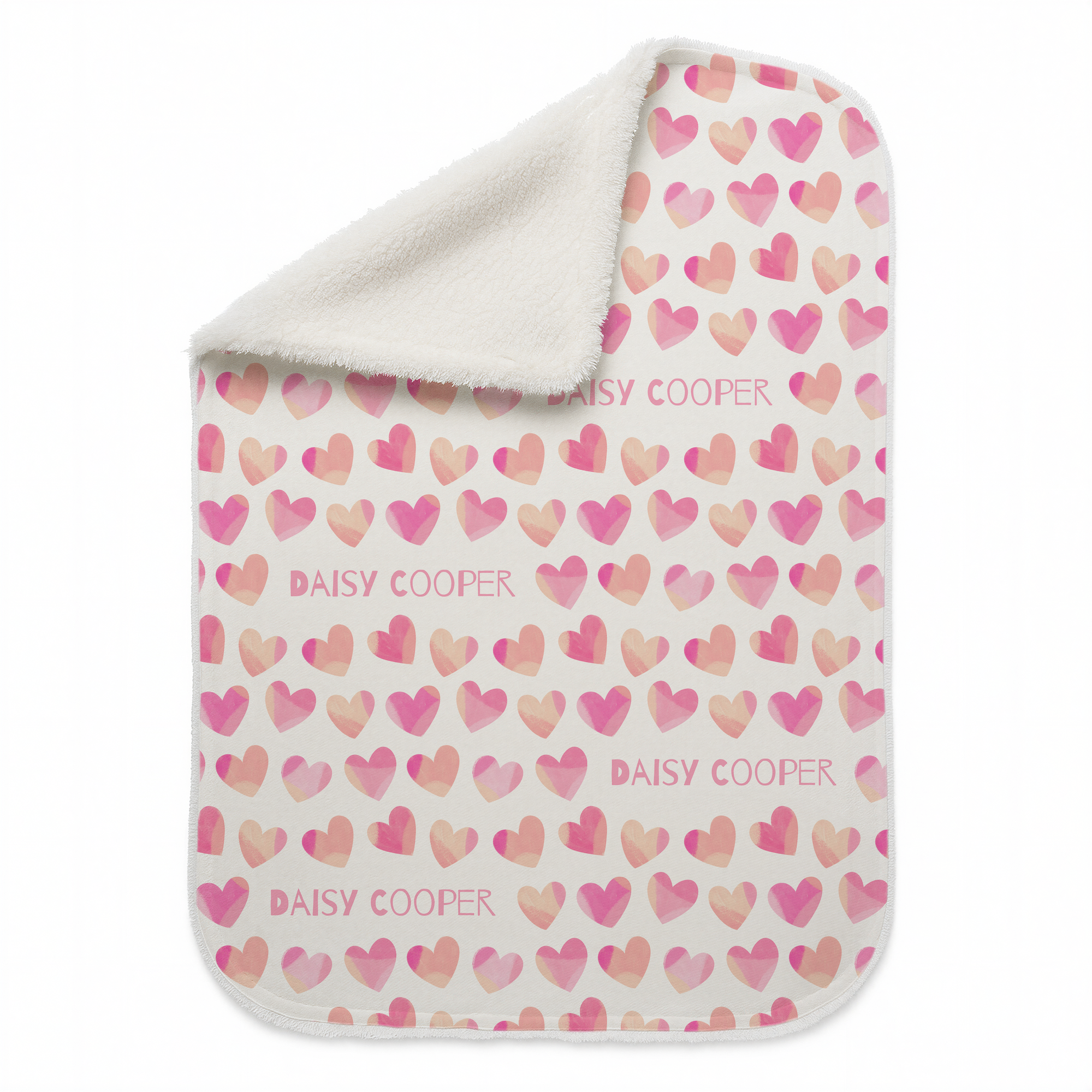 Keep your baby cosy with this personalised sherpa blanket, featuring their name and a soft pink heart design. A thoughtful gift and lasting keepsake for any new arrival.
