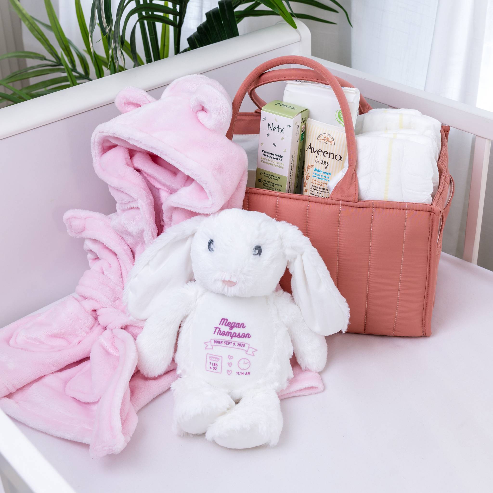 A thoughtful newborn essentials set, perfect for welcoming a new baby into the world. This beautifully presented gift includes cosy clothing, gentle skincare, and a personalised keepsake toy to celebrate baby’s arrival.
