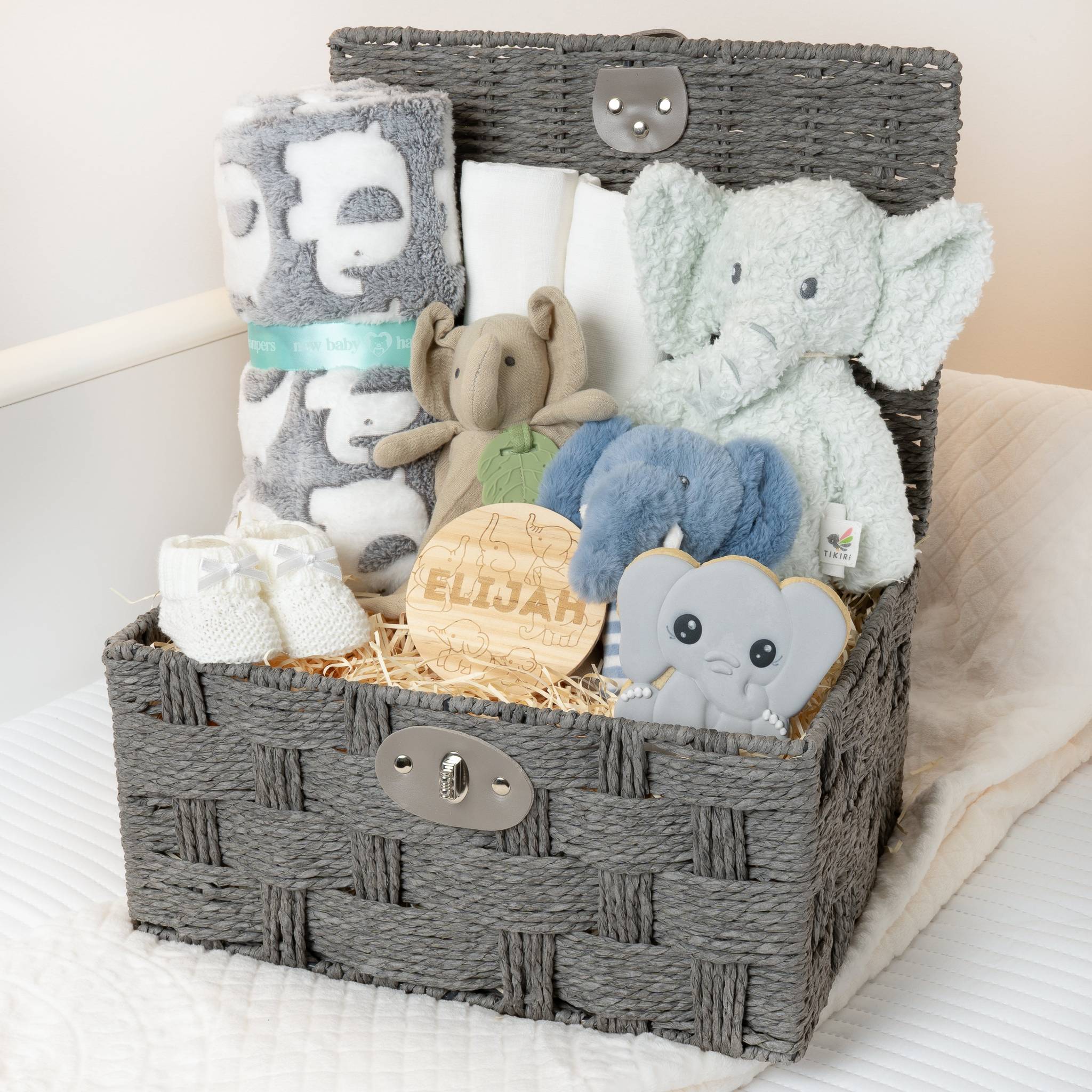 A beautifully curated gift hamper with soft, organic toys and essential baby items, all presented in a stylish grey rope basket. Personalised with a wooden name disc for a thoughtful finishing touch.
