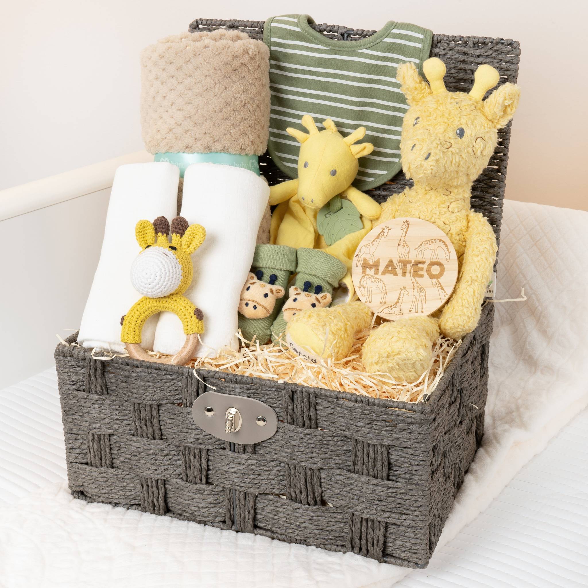 Packed with organic giraffe toys, cosy baby essentials, and a personalised wooden disc, this safari-inspired hamper makes a thoughtful baby shower or newborn gift.