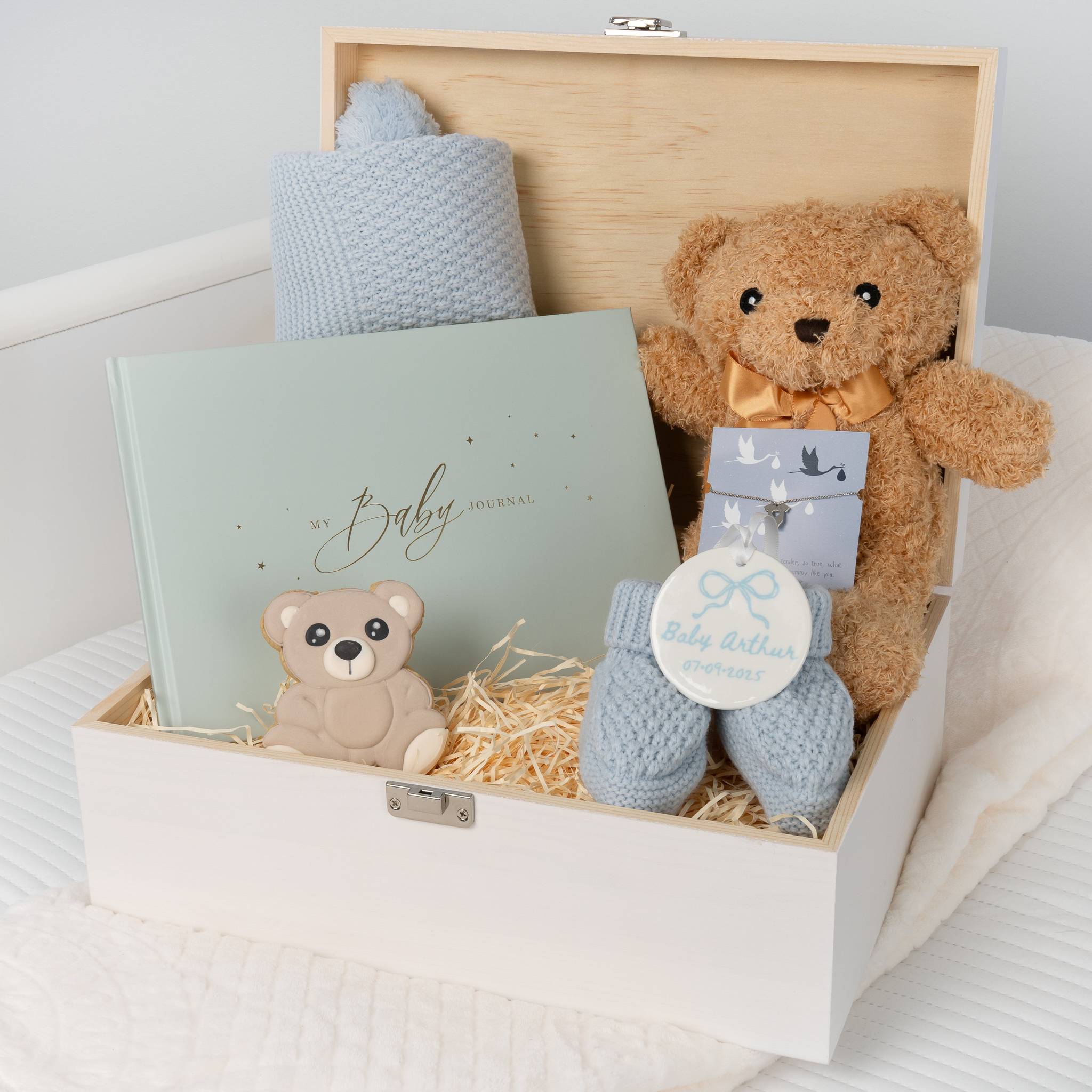 A timeless keepsake for a newborn, this elegant wooden box is filled with thoughtful treasures for baby and a few special details to mark their arrival. Featuring a soft teddy bear, baby-safe treats and a beautiful personalised ceramic tag, this hamper makes a unique and heartfelt gift to welcome a new baby.