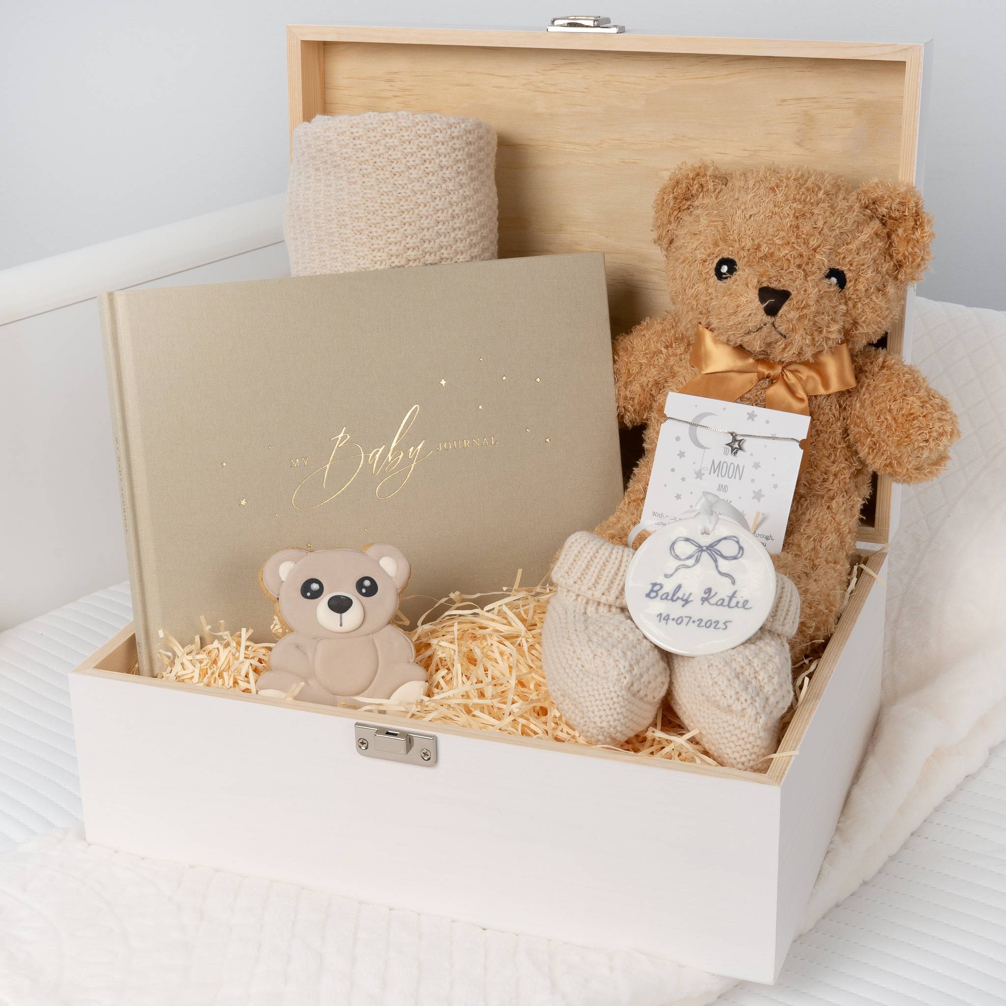 A timeless keepsake for a newborn, this elegant wooden box is filled with thoughtful treasures for baby and a few special details to mark their arrival. Featuring a soft teddy bear, baby-safe treats and a beautiful personalised ceramic tag, this hamper makes a unique and heartfelt gift to welcome a new baby.