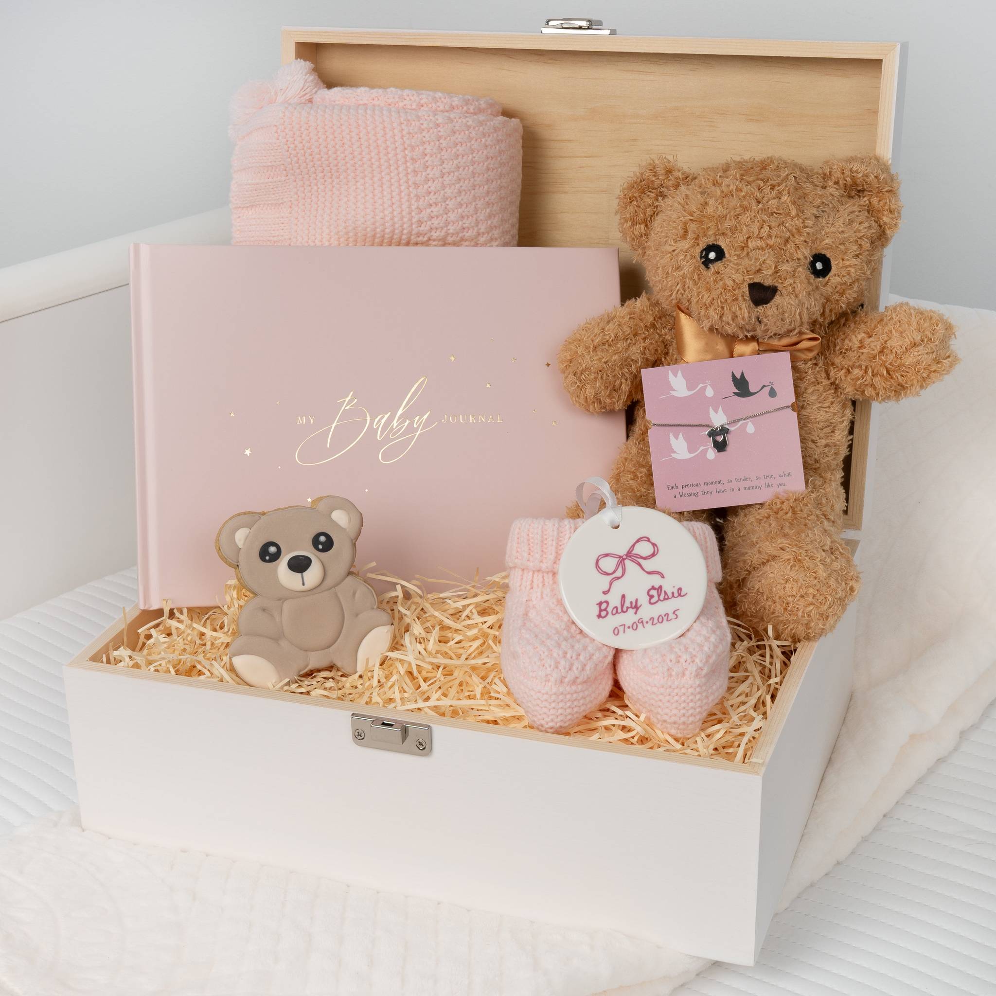 A timeless keepsake for a newborn, this elegant wooden box is filled with thoughtful treasures for baby and a few special details to mark their arrival. Featuring a soft teddy bear, baby-safe treats and a beautiful personalised ceramic tag, this hamper makes a unique and heartfelt gift to welcome a new baby.
