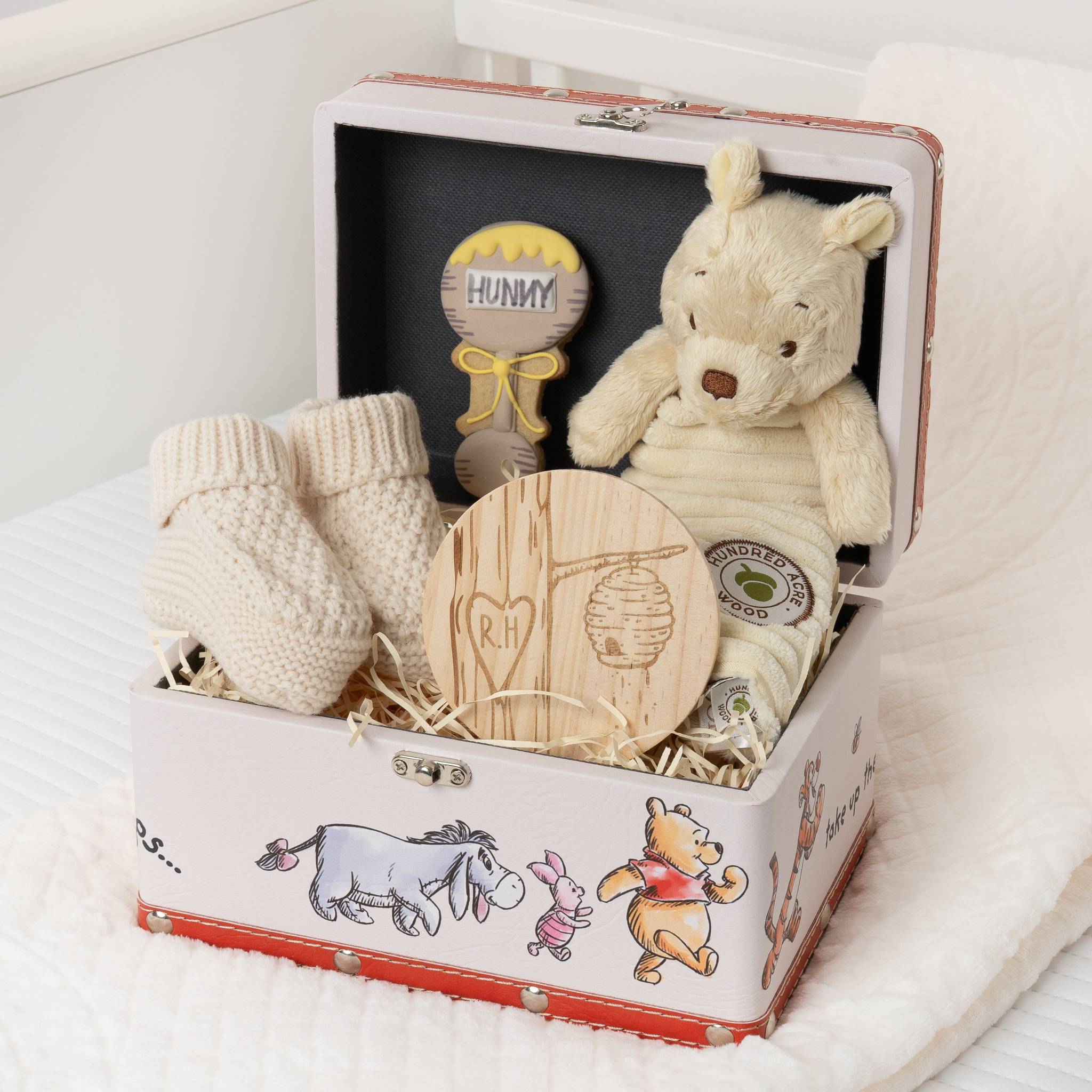 A heartwarming gift inspired by the timeless magic of the Hundred Acre Wood. This Winnie the Pooh hamper is designed to welcome a new baby with softness, comfort and a thoughtful personal touch. Beautifully arranged in a keepsake case, it’s one to treasure.