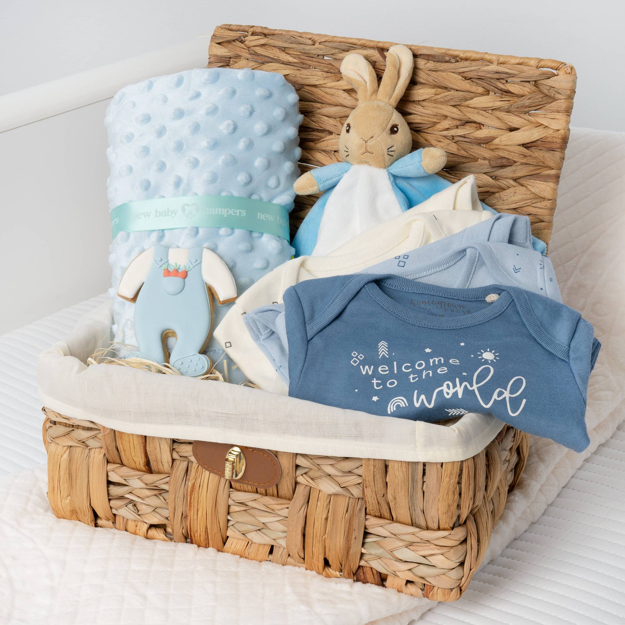 A soft and practical gift for welcoming a new baby boy into the world. This lovely hamper brings together cosy essentials and a sweet storybook friend, all beautifully arranged in a handwoven keepsake basket.