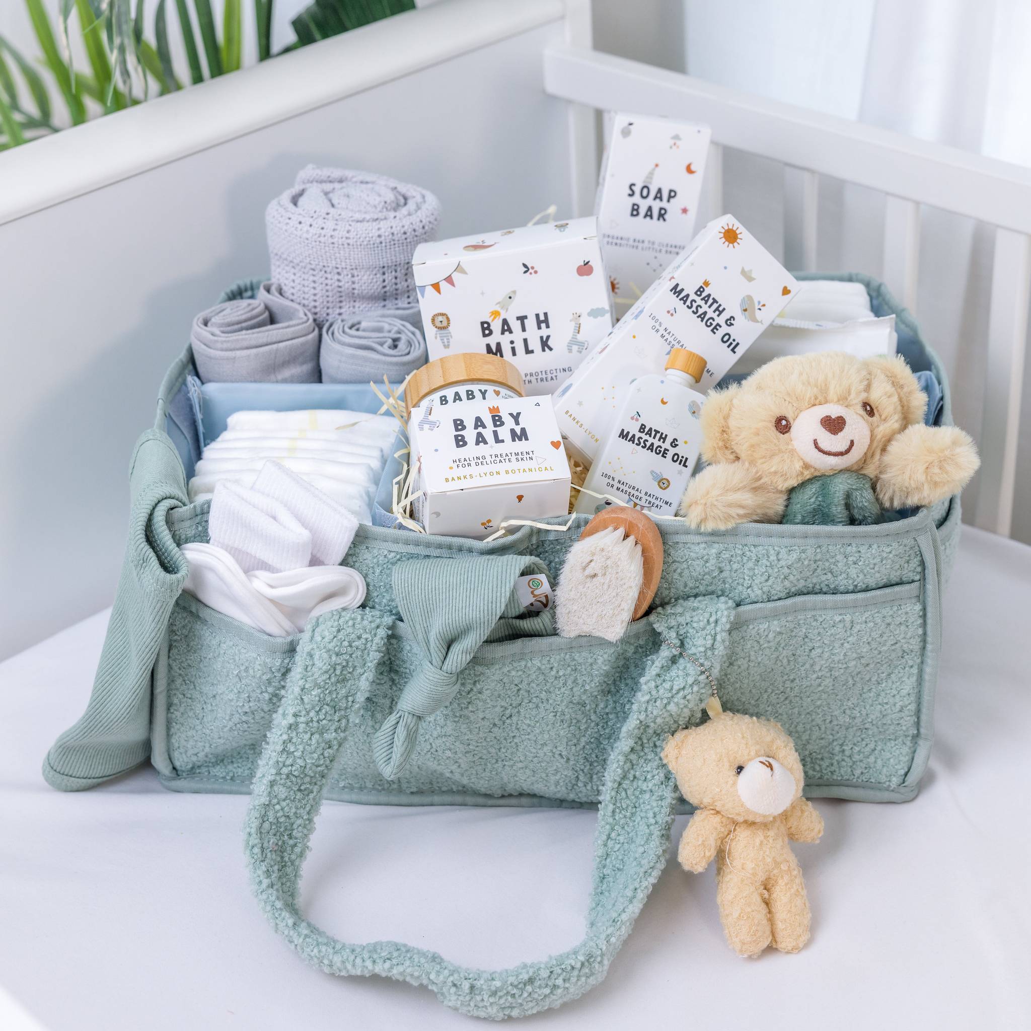 This carrier is packed to the brim with new baby essentials containing 14 items to keep the newborn comfortable and clean.