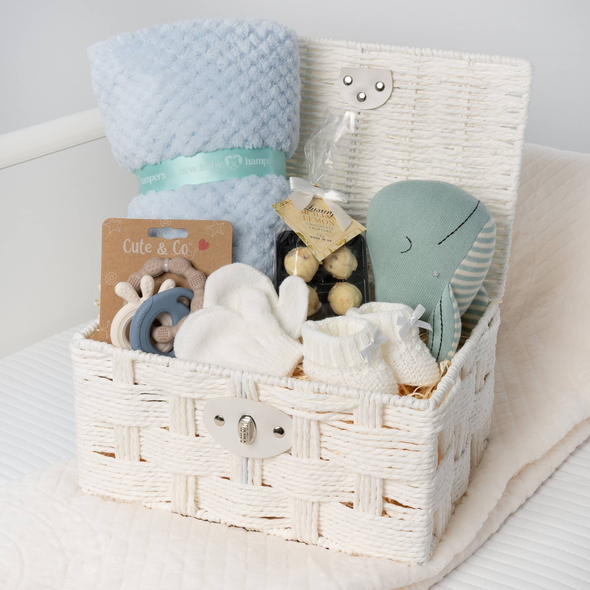 A gentle and thoughtful gift for a new arrival, this hamper blends soothing textures with playful touches and a treat for the parents. Packed in a stylish white rope basket, it's filled with comforting essentials and a soft whale companion.